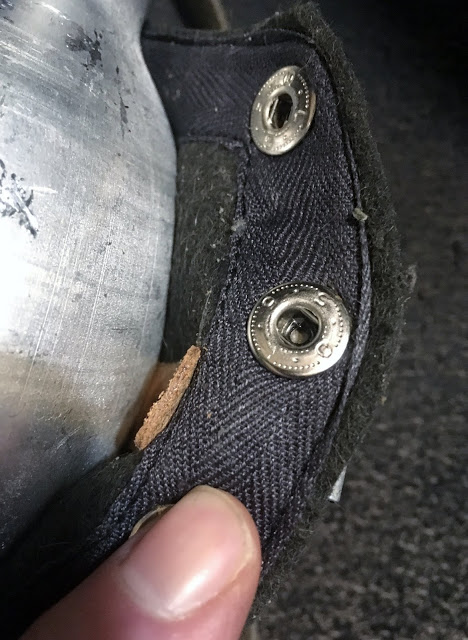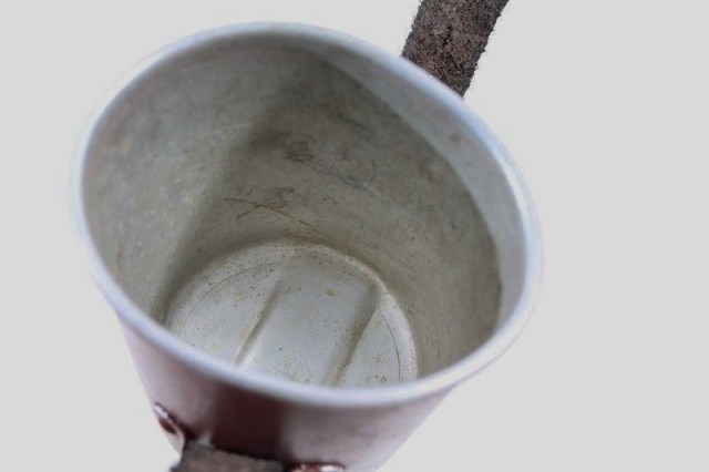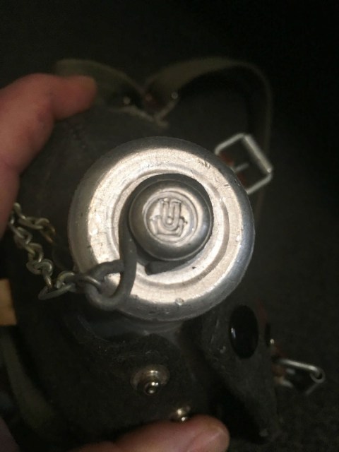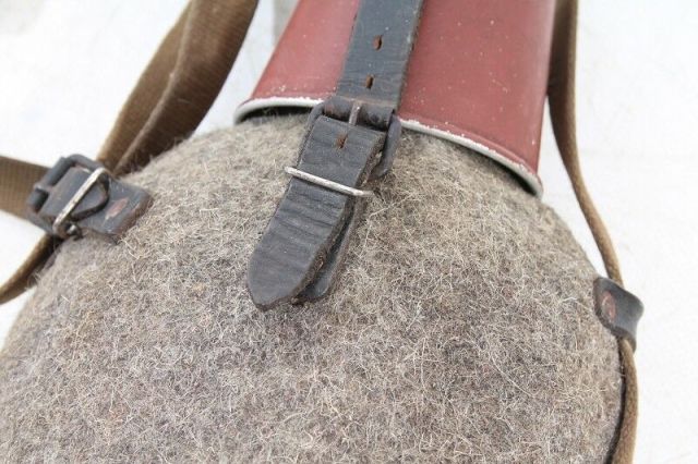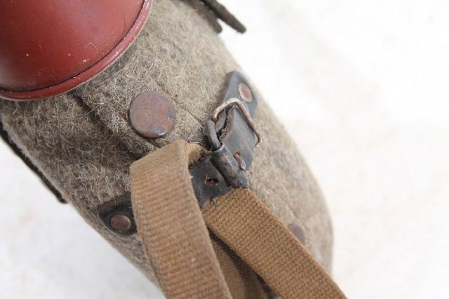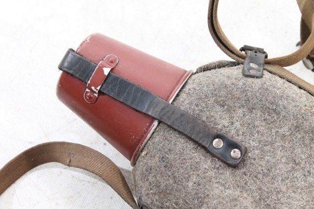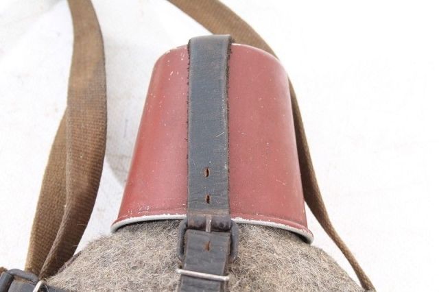 Our first example of the KVP medic canteen, seen in the photos below, has a field grey felt cover over the unpainted aluminum canteen body. The drinking cup is painted grey and maker marked on top. It has brown leather fastening straps and a webbed canvas carrying strap.