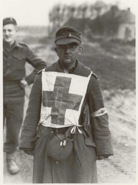 | A captured German Sanitäter with his Feldflasche slung over his shoulder during WW2. |